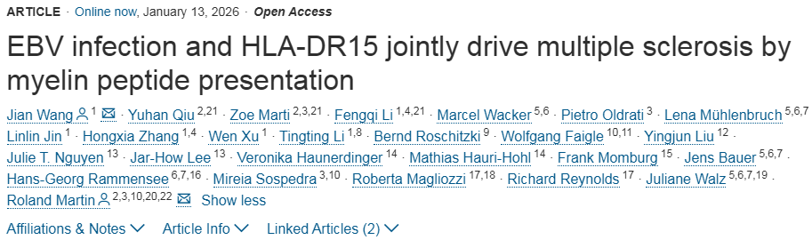 Jian Wang et al, EBV Infection and HLA-DR15 Jointly Drive Multiple Sclerosis by Myelin Peptide Presentation, Cell (2026). DOI: 10.1016/j.cell.2025.12.046.