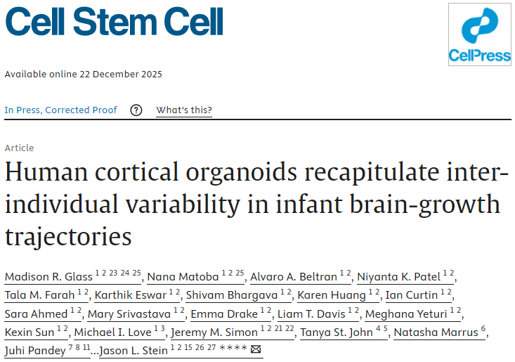 Madison R. Glass et al, Human cortical organoids recapitulate inter-individual variability in infant brain-growth trajectories, Cell Stem Cell (2025). DOI: 10.1016/j.stem.2025.12.001.