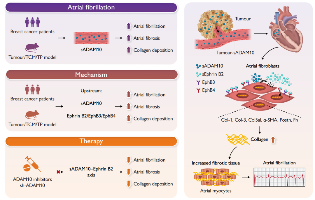 该研究首次揭示了乳腺癌来源的可溶性ADAM10 (sADAM10)是增加房颤易感性的关键分子,且独立于其他危险因素及抗肿瘤治疗后的继发心脏毒性,有望为肿瘤相关的心房颤动提供新的治疗思路和策略。