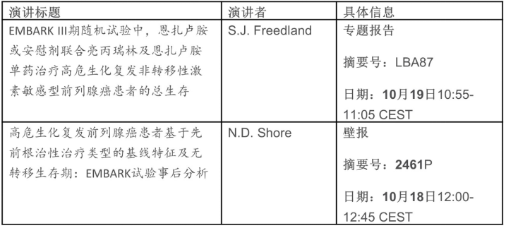 · 前列腺癌领域的研究成果,重点为恩扎卢胺与亮丙瑞林联合治疗和单药治疗方案在高风险生化复发非转移性激素敏感性前列腺癌患者中的最终整体生存数据。
