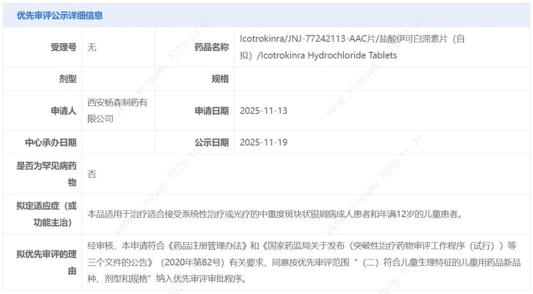 中国国家药监局药品审评中心官网近日公示,强生申报的1类新药icotrokinra因“符合儿童生理特征的儿童用药品新品种、剂型和规格”拟纳入优先审评。