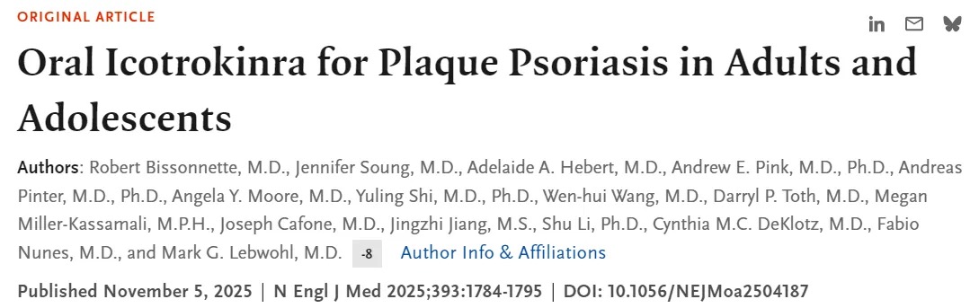 [2]Robert Bissonnette, et al., (2025). Oral Icotrokinra for Plaque Psoriasis in Adults and Adolescents. N Engl J Med, DOI: 10.1056/NEJMoa2504187