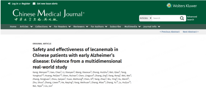 2. Kang W, Gao C, Li X, et al. Safety and effectiveness of lecanemab in Chinese patients with early Alzheimer's disease: Evidence from a multidimensional real-world study. Chinese Medicine Journal. (In press, DOI: 10.1097/CM9.0000000000003888).