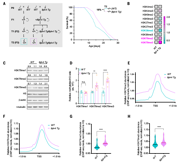 为找到这种 “记忆” 的载体,团队聚焦表观遗传变化——这类不改变 DNA 序列、却能调控基因表达的化学修饰。通过对比 lipl-4 Tg 线虫与野生型线虫的组蛋白修饰水平,他们发现:长寿线虫体内组蛋白 H3 第 79 位赖氨酸的二甲基化(H3K79me2)和三甲基化(H3K79me3)水平显著升高,而其他常见组蛋白修饰(如 H3K4me3、H3K9me2)并无明显变化(图 1B-D)。进一步的染色质免疫共沉淀测序(ChIP-seq)显示,H3K79me2/me3 的升高广泛分布在基因组中,尤其集中在基因转录起始位点(TSS)上下游 1kb 区域(图 1E-H),提示这种修饰可能通过激活特定基因表达调控长寿。