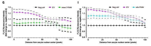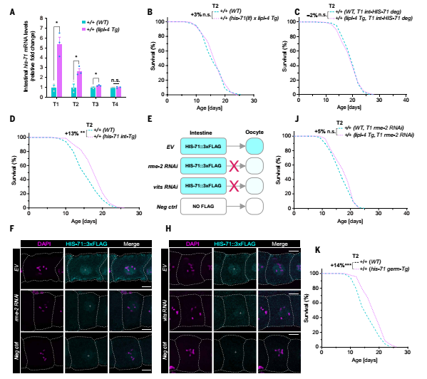 通过构建肠道特异性表达 FLAG 标签 HIS-71 的转基因线虫,团队用免疫荧光技术观察到:肠道合成的 HIS-71::3×FLAG 能通过卵黄蛋白(vitellogenins)和其受体 RME-2 的运输系统,进入生殖细胞的卵母细胞中。当用 RNAi 干扰 rme-2 或卵黄蛋白基因时,卵母细胞中的 HIS-71 信号显著减弱,甚至消失;同时,HIS-71 从肠道到生殖细胞的运输被阻断后,lipl-4 Tg 线虫的长寿效应也无法传递给子代。这证明,HIS-71 的 “跨界运输” 是长寿跨代传递的核心步骤——它像一位 “信使”,将体细胞中溶酶体激活的信号带入生殖细胞,为后代的长寿埋下 “伏笔”。