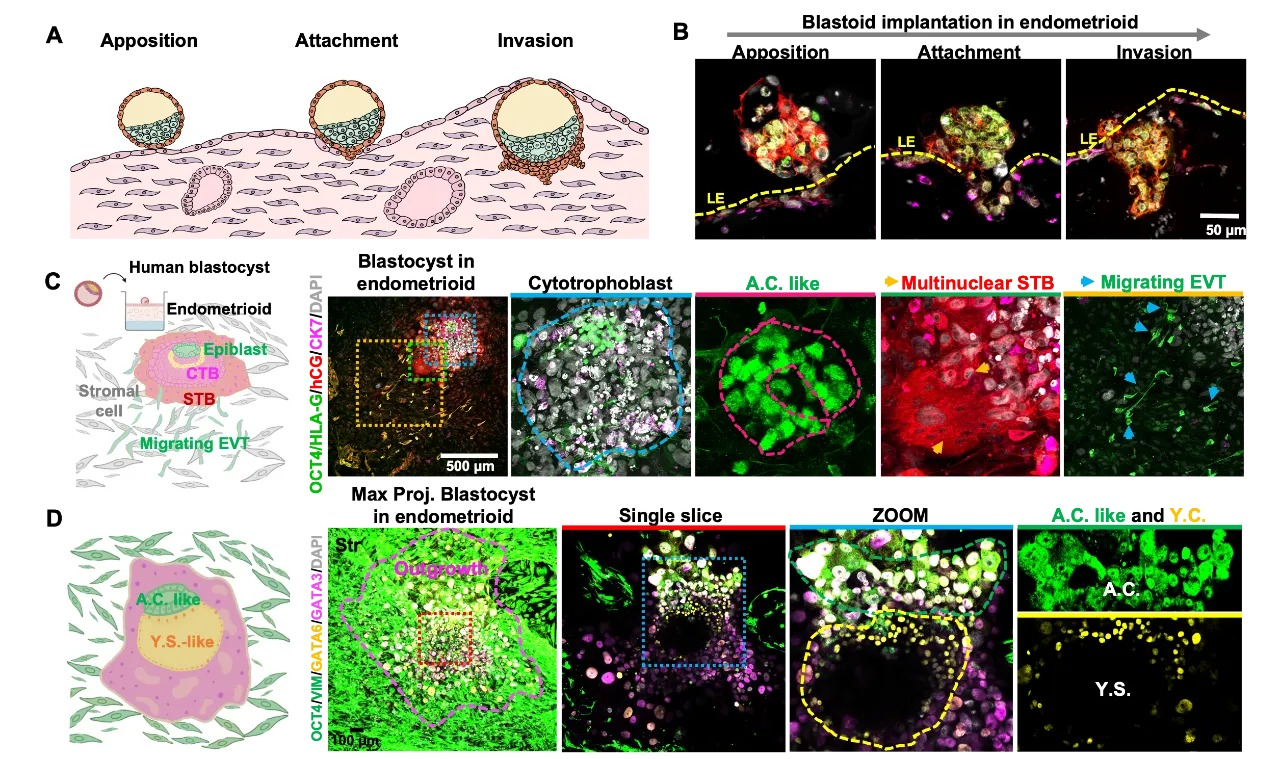 胚胎植入是指发育至囊胚阶段的胚胎通过与母体子宫内膜发生定位、附着并最终入侵内膜基质的过程,是成功妊娠的第一步。胚胎植入失败,严重影响女性健康及出生人口数量。因此,对胚胎植入的研究至关重要。然而,胚胎植入发生于子宫内,无法直接研究。因此,迫切需要在体外建立人胚胎植入模型,还原真实的胚胎植入过程及植入后胚胎发育。