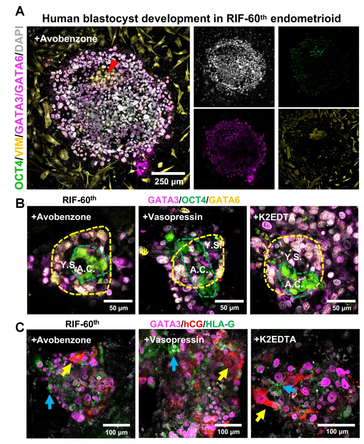 该研究通过微流控芯片构建“分层培养体系”——底层为细胞外基质凝胶,中层为 Endometrioid 核心,上层为腔上皮单层,模拟体内子宫内膜的分层结构。该体系不仅能让胚胎(包括自然囊胚以及干细胞构建的人工囊胚)在分泌期激素的辅助下完成“定位-附着-入侵”的完整过程,还成功支持人植入后胚胎发育至体内 12-14 天的阶段:类囊胚/囊胚植入后 3-5 天,可分化出合体滋养层细胞(STB,hCG 阳性)、绒毛外滋养层细胞(EVT,HLA-G 阳性);7 天后,能形成由 OCT4 阳性细胞构成的原羊膜腔(A.C.)、GATA6 阳性细胞构成的原卵黄囊(Y.S.)。