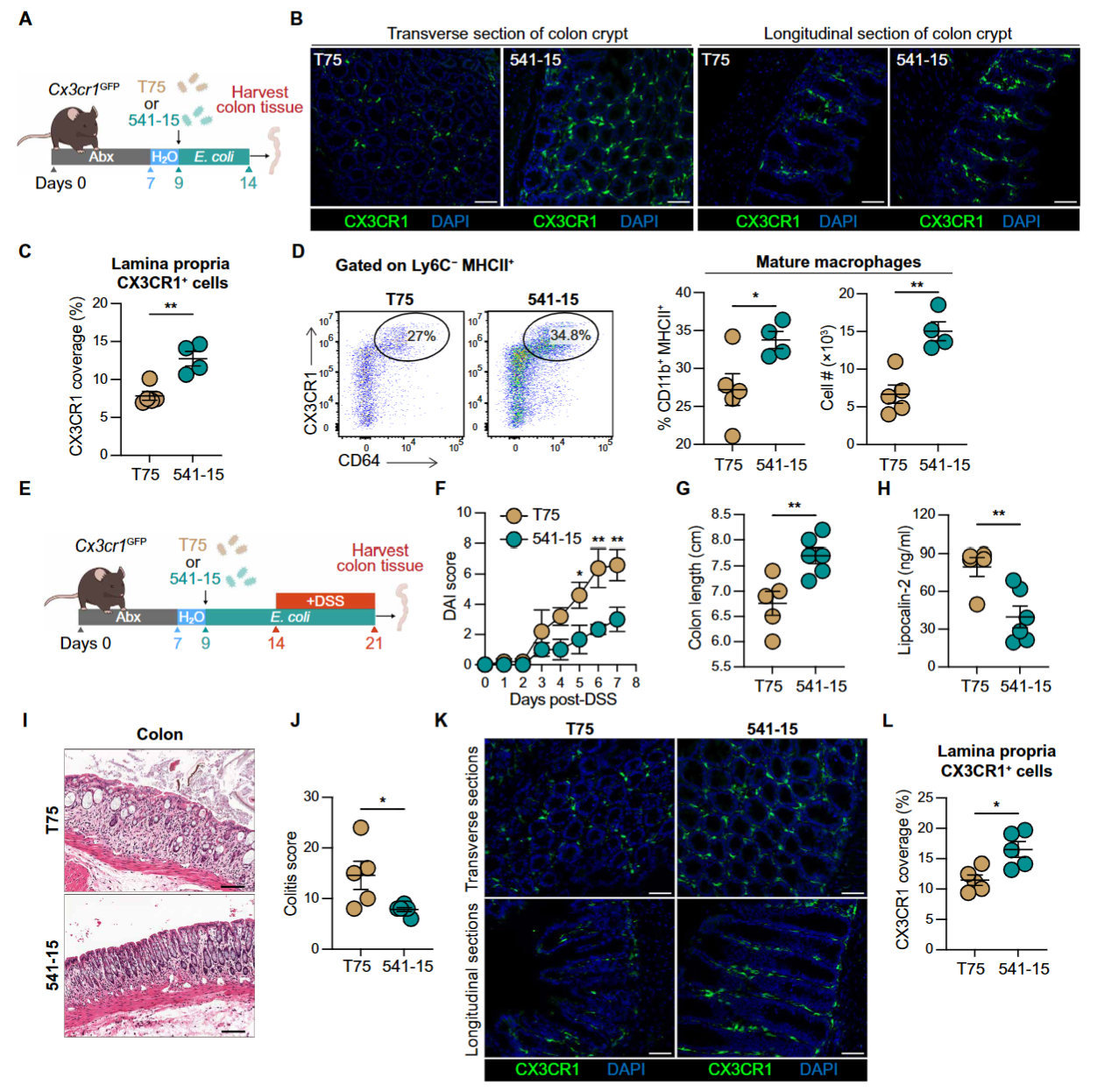 图1:大肠杆菌541-15定殖促进结肠固有层CX3CR1阳性巨噬细胞募集并改善DSS诱导的结肠炎结局