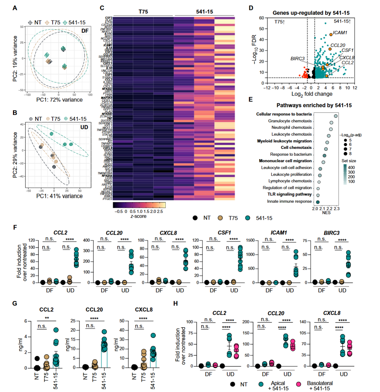 进一步研究发现,大肠杆菌541-15的作用靶点是未分化的结肠上皮细胞。研究团队利用人结肠类器官构建分化和未分化上皮细胞模型,结果显示,大肠杆菌541-15仅能诱导未分化上皮细胞发生显著转录组变化,上调核因子κB信号通路及CCL2、CCL20、CXCL8等趋化因子的表达,且这些趋化因子会从上皮细胞基底侧定向分泌,而分化成熟的结肠上皮细胞则无明显应答。