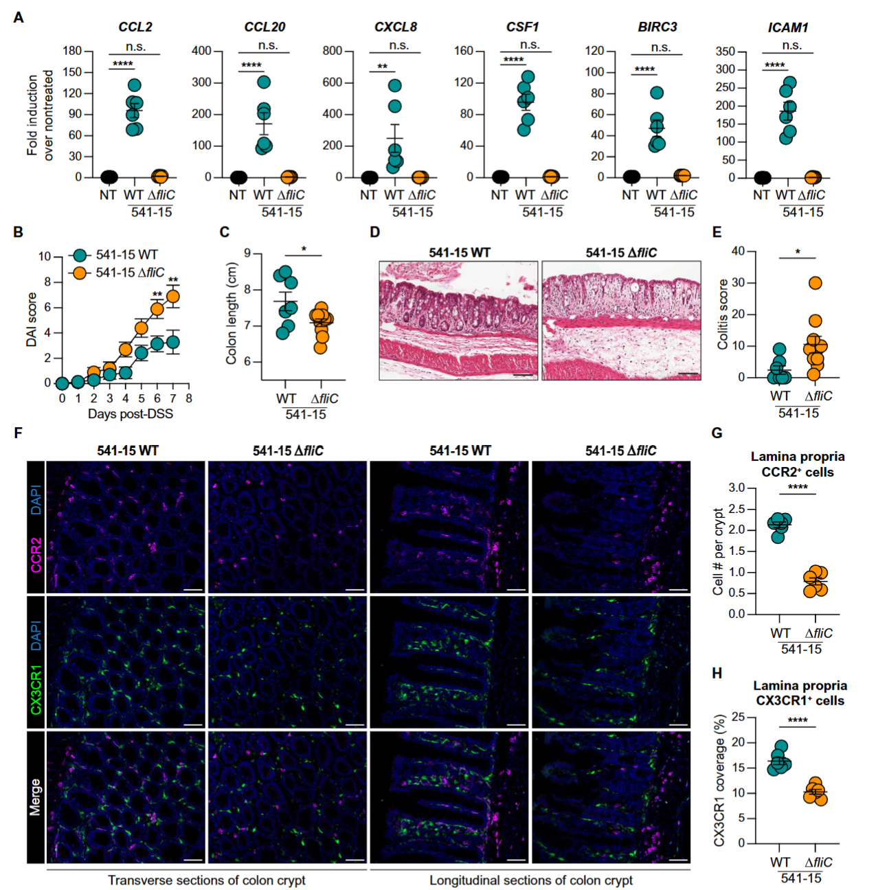 图3:鞭毛蛋白是CCR2阳性细胞募集和结肠炎结局改善的必需因子