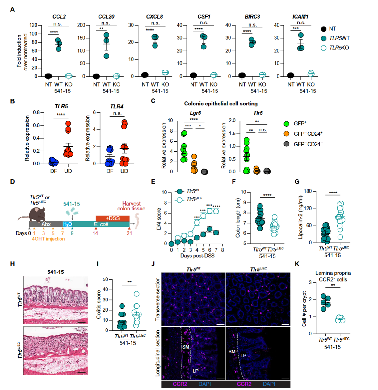 图4:肠上皮TLR5是大肠杆菌541-15增强CCR2阳性细胞募集和结肠炎保护的必需分子