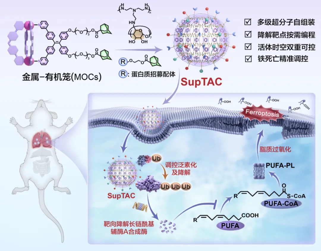 该研究开发了超分子靶向嵌合体(SupTAC)技术,首次在活体动物模型中实现可编程、时空可控的靶向蛋白质降解,为蛋白质稳态调控与疾病治疗研究开辟了新路径。