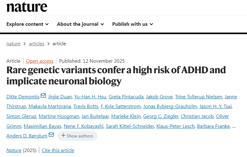 Demontis, D., Duan, J., Hsu, YH.H. et al. Rare genetic variants confer a high risk of ADHD and implicate neuronal biology. Nature (2025). doi:10.1038/s41586-025-09702-8