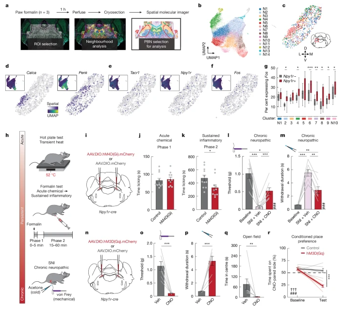为了确认 Y1R 神经元的核心作用,研究人员做了两组关键实验:给正常小鼠注射药物抑制 Y1R 神经元,原本会因炎症或神经损伤表现出的慢性疼痛行为(如舔爪、回避触碰)显著减轻;反之,用化学遗传技术激活健康小鼠的 Y1R 神经元,即使没有受伤,小鼠也会出现类似慢性疼痛的症状——对轻微触碰过度敏感、主动回避特定环境,甚至表现出焦虑样行为。这说明,Y1R 神经元的活动不仅是疼痛的 “旁观者”,更是慢性疼痛状态的 “驱动者”。