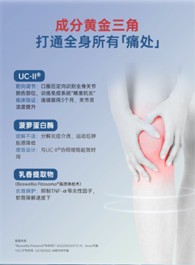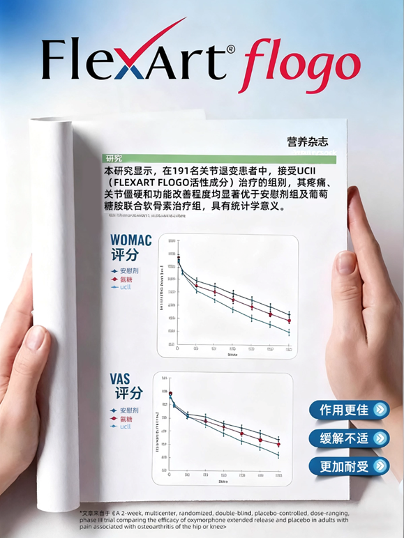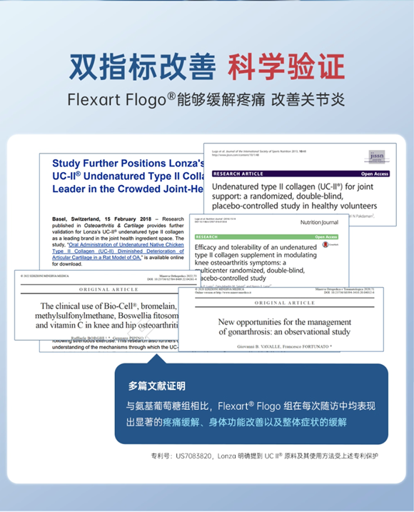 Flexart® Flogo系列拥有三大核心专利成分,精准针对关节炎症、软骨退化和疼痛的关键机制: