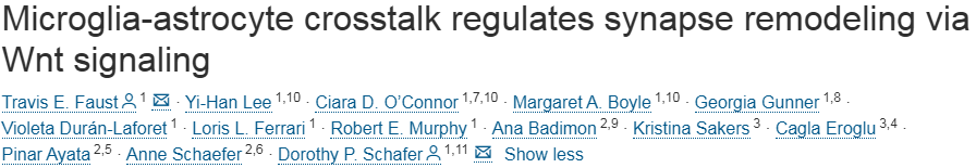 相比之下,小胶质细胞是常驻的免疫细胞,负责监测大脑,通常会吞噬突触。Faust说:"我们发现小胶质细胞会分泌一种叫做Wnts的分子,这种分子向星形胶质细胞发出信号。这种信号传导导致星形胶质细胞将其微小的分支从突触处移开,从而让小胶质细胞能够迅速进入并吞噬这些突触。"