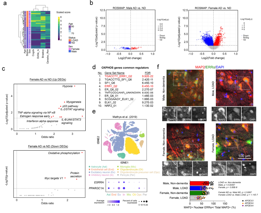 研究团队首先分析ROSMAP人类队列的613例脑样本发现,女性迟发性阿尔茨海默病患者的脑内分子变化远较男性剧烈:女性患者与非痴呆人群相比,差异表达基因多达6615个,而男性仅439个。这些女性特异性变化中,线粒体氧化磷酸化通路基因显著下调,神经炎症通路基因异常上调,雌激素相关受体α(ERRα)被确认为能量代谢通路的核心调控因子,其在神经元核内的活性随女性年龄增长和疾病进展持续降低。