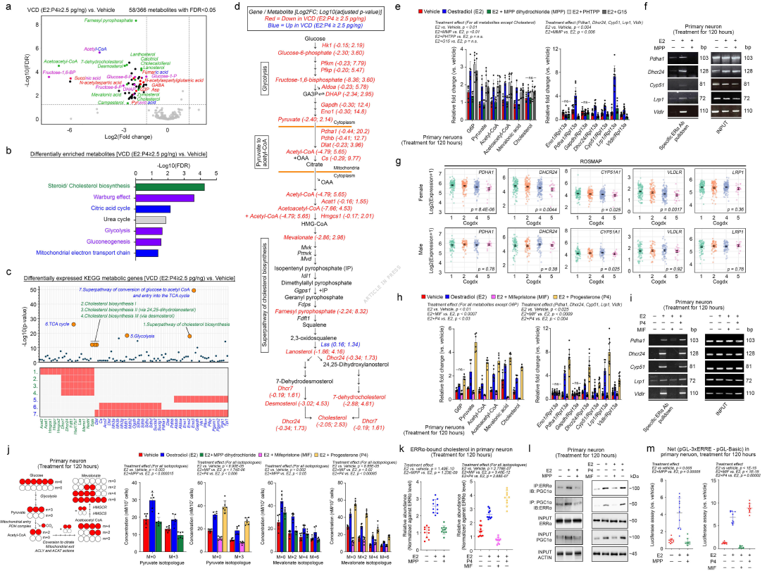 深入机制研究发现,激素失衡的破坏力集中于ERRα-PGC1α信号网络。围绝经期激素紊乱会导致ERRα及其共激活因子PGC1α的核定位减少,二者相互作用减弱,而这一过程依赖胆固醇稳态的破坏——胆固醇作为ERRα的天然配体,其与ERRα的结合在激素失衡时显著减少,进而抑制ERRα转录活性。进一步证实,孕酮通过引导雌激素受体α(ERα)信号,调控胆固醇生物合成及摄取相关基因表达,维持神经元胆固醇稳态,这是ERRα-PGC1α轴功能正常的关键前提,一旦这一调控通路断裂,能量代谢紊乱与神经损伤便会接踵而至。