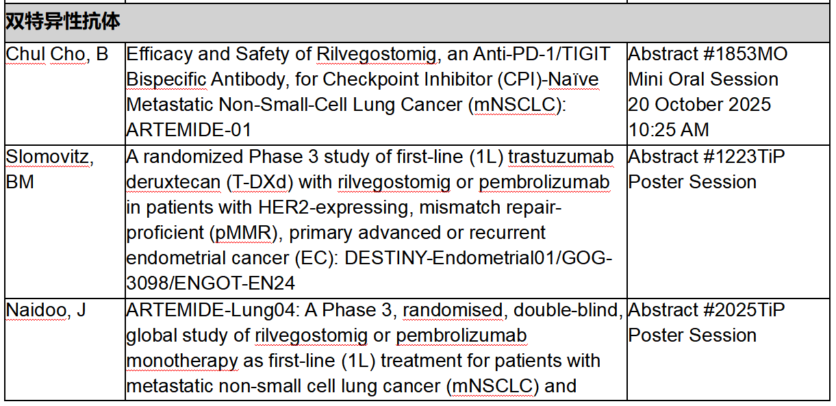 • ARTEMIDE-01:评估rilvegostomig用于检查点抑制剂初治的转移性非小细胞肺癌(NSCLC)患者的I/II期临床研究(简短口头报告摘要#1853MO)。
