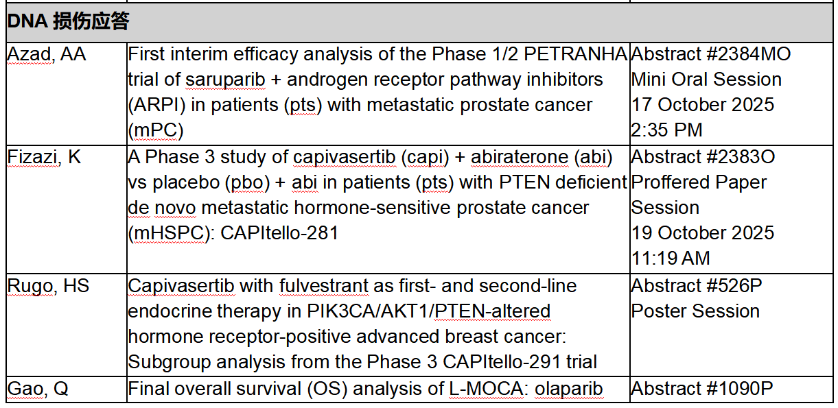 • PETRANHA:评估saruparib联合雄激素受体通路抑制剂用于治疗转移性前列腺癌患者的I/II期临床研究(简短口头报告摘要#2384MO)。