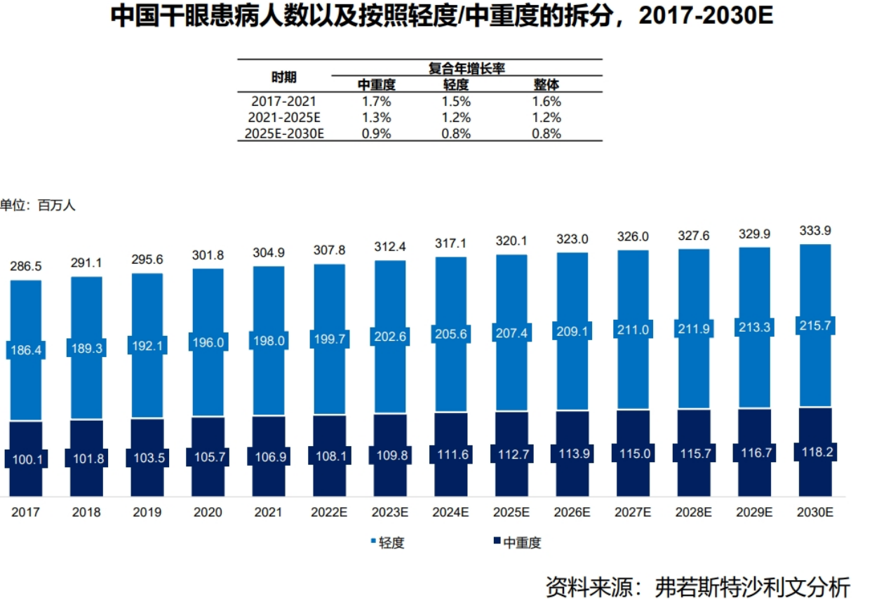 在电子产品日益普及等因素的影响下,干眼症正日益表现出患病群体年轻化、患病率提升等特征。据弗若斯特沙利文数据,2017-2021年我国干眼的整体复合年增长率为1.6%,其中,中重度和轻度干眼症的复合年增长率分别为1.7%和1.5%。且从就诊情况来看,目前,医疗机构门诊就诊的干眼症患者占眼科总就诊人数的30%以上,预计未来5-10年,该比例可能会上升到40%。