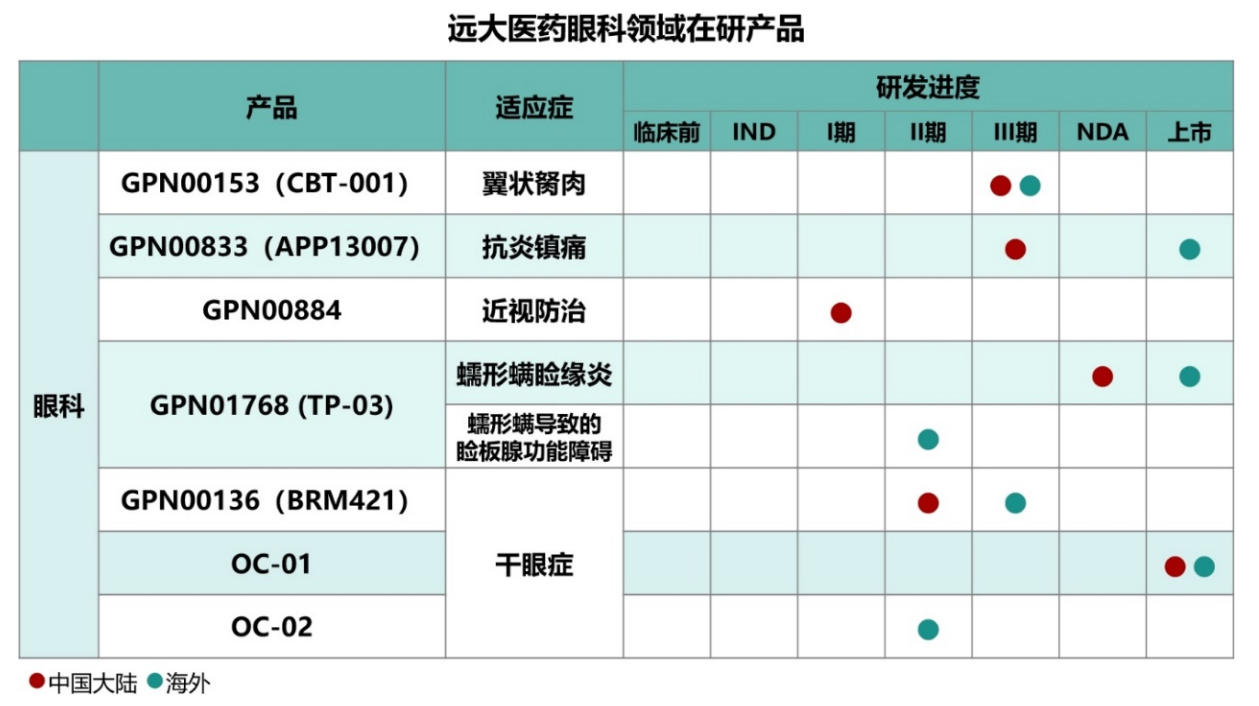除了OC-01外,远大医药还有另外两款创新眼药近期也取得重磅进展:公司治疗蠕形螨睑缘炎的全球创新眼科药物GPN01768 (TP-03,洛替拉纳滴眼液,0.25%)于2025年5月获得中国澳门药监局批准上市,其在中国大陆的新药上市申请已于2024年12月获得国家药监局受理;公司用于治疗翼状胬肉的创新改良型新药GPN00153 (CBT-001)于2025年6月完成国际多中心III期临床研究全球中心全部患者入组。此外,公司用于抗炎镇痛的激素纳米混悬滴眼液GPN00833已于2024年11月完成国内III期临床研究并达到了临床终点。