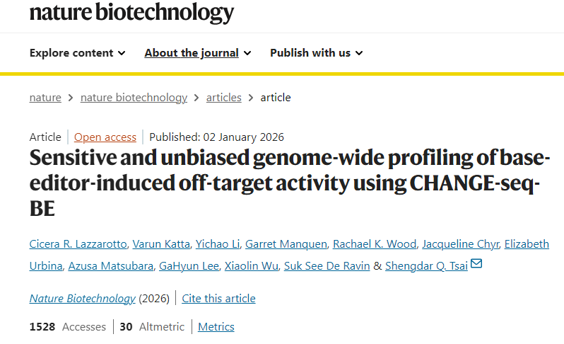 Lazzarotto, C.R., Katta, V., Li, Y. et al. Sensitive and unbiased genome-wide profiling of base-editor-induced off-target activity using CHANGE-seq-BE. Nat Biotechnol (2026). doi:10.1038/s41587-025-02948-7