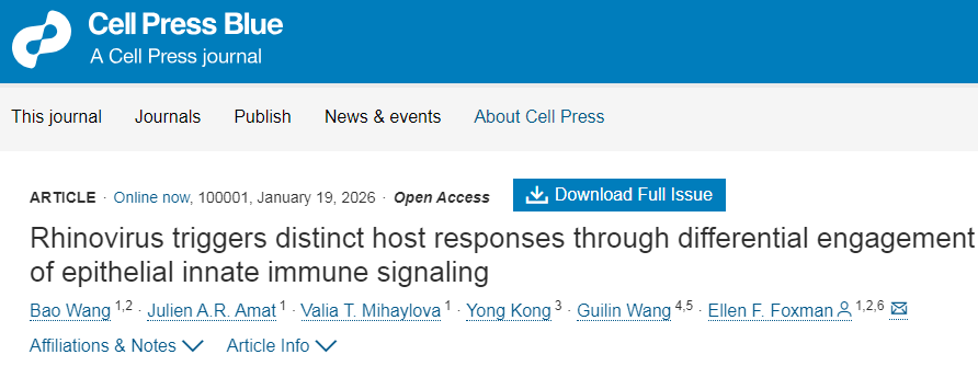 Bao Wang,Julien A.R. Amat,Valia T. Mihaylova,et al. Rhinovirus triggers distinct host responses through differential engagement of epithelial innate immune signaling. Cell Press Blue. doi: 10.1016/j.cpblue.2025.100001.