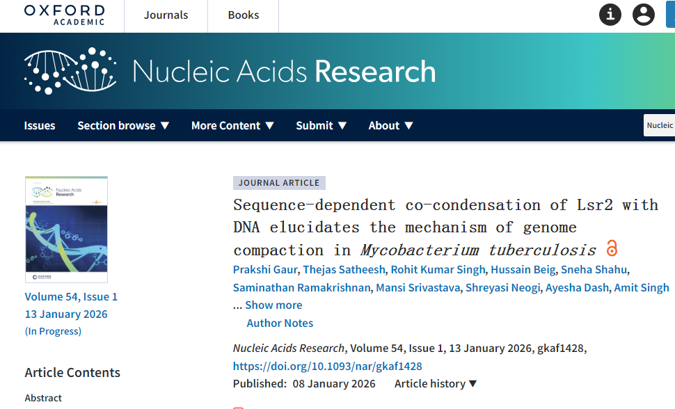 Prakshi Gaur,Thejas Satheesh,Rohit Kumar Singh, et al. Sequence-dependent co-condensation of Lsr2 with DNA elucidates the mechanism of genome compaction in Mycobacterium tuberculosis,Nucleic Acids Research, Volume 54, Issue 1, 13 January 2026, gkaf1428, doi:10.1093/nar/gkaf1428