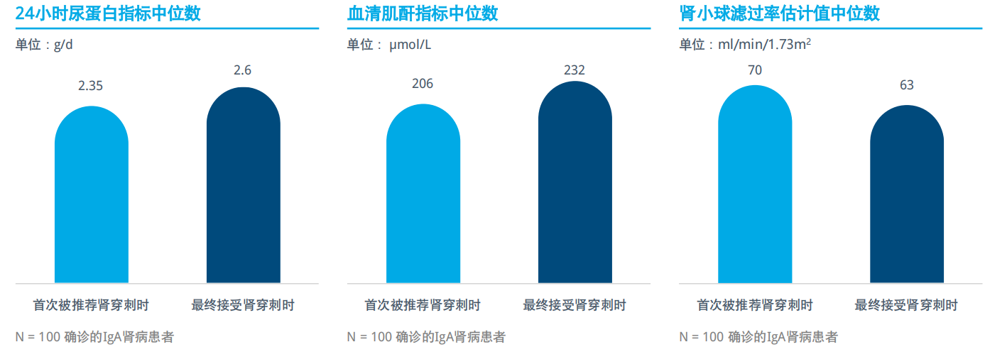 然而,IgA肾病早期症状隐匿且缺乏特异性,诊断高度依赖于肾穿刺活检这一侵入性检查。患者普遍存在对疾病认知不足以及对肾穿刺活检的恐惧心理,导致就诊延迟、确诊延迟、治疗不及时影响预后的情况。调研数据显示,从首次被医生推荐肾穿刺到最终接受穿刺并确诊的平均时间间隔为2.7个月,且67%的患者需要经过2位及以上医生的反复推荐才能最终接受肾穿刺。这一“犹豫期”也普遍导致了患者病情的加重,在接受肾穿刺时,患者24小时尿蛋白定量中位数已达2.6g/天,远高于0.5g/天的建议达标值。
