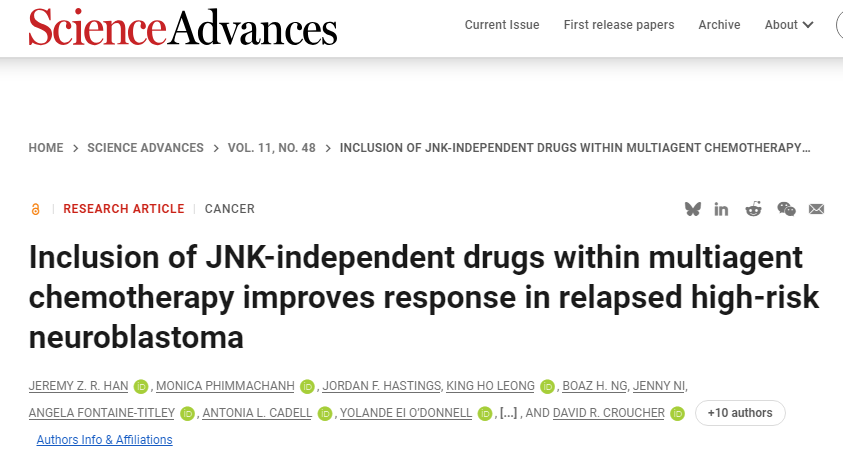 JEREMY Z. R. HAN,MONICA PHIMMACHANH,JORDAN F. HASTINGS, et al. Inclusion of JNK-independent drugs within multiagent chemotherapy improves response in relapsed high-risk neuroblastoma. Science Advances,2025 doi: 10.1126/sciadv.ady5599.
