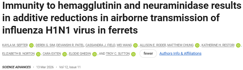 Kayla Septer et al, Immunity to hemagglutinin and neuraminidase results in additive reductions in airborne transmission of influenza H1N1 virus in ferrets, Science Advances (2026). DOI: 10.1126/sciadv.aea8719.