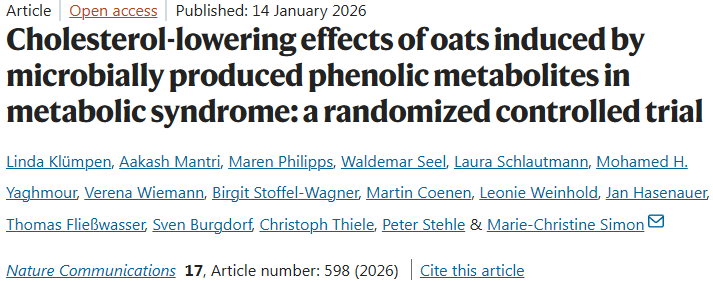 Linda Klümpen et al, Cholesterol-lowering effects of oats induced by microbially produced phenolic metabolites in metabolic syndrome: a randomized controlled trial, Nature Communications (2026). DOI: 10.1038/s41467-026-68303-9.