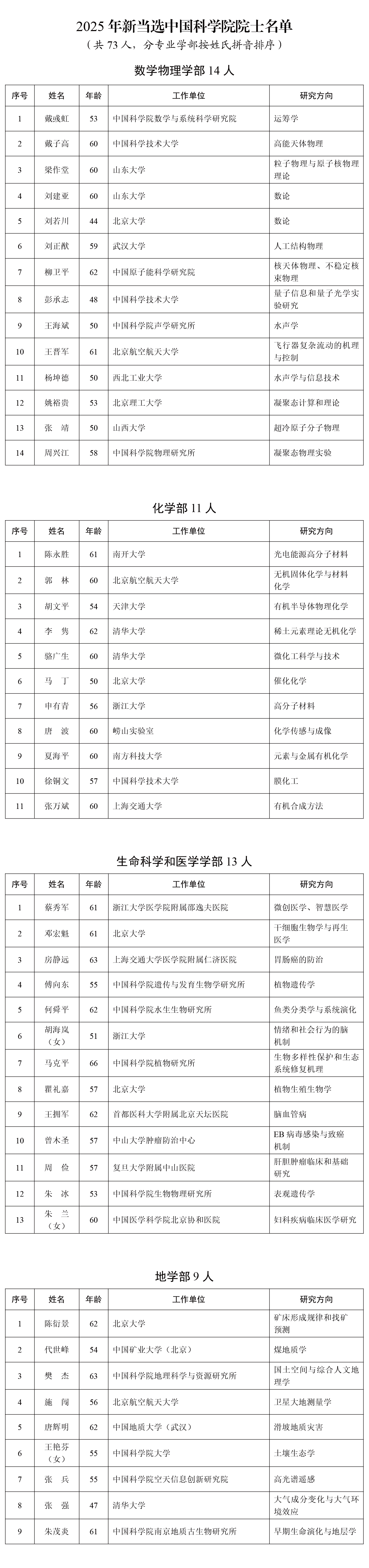 根据《中国科学院院士章程》《中国科学院院士增选工作实施办法(试行)》《中国科学院外籍院士选举办法》等规定,2025年中国科学院选举产生了73名中国科学院院士和27名中国科学院外籍院士。