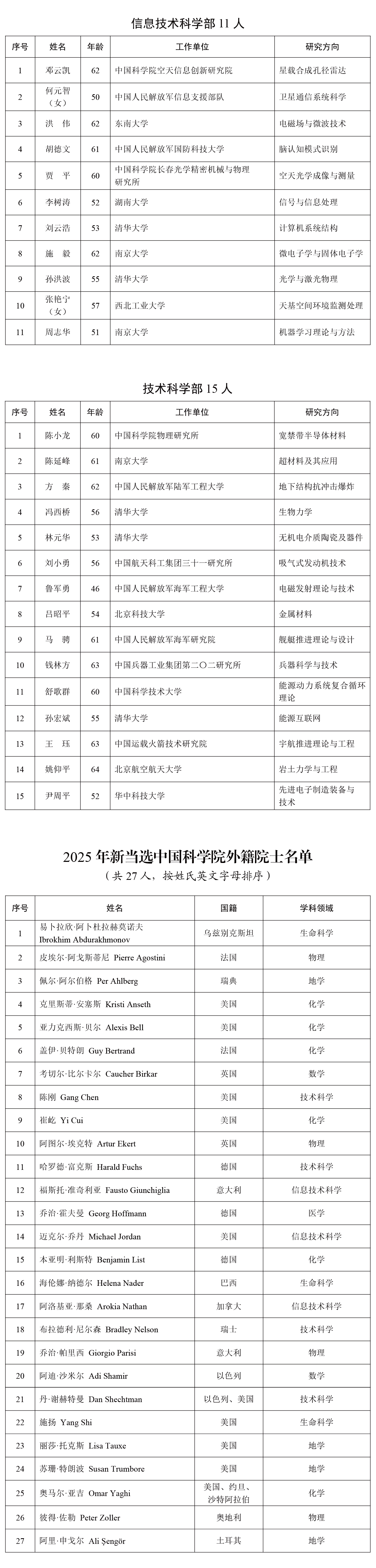 关于公布2025年中国科学院院士增选当选院士名单的公告