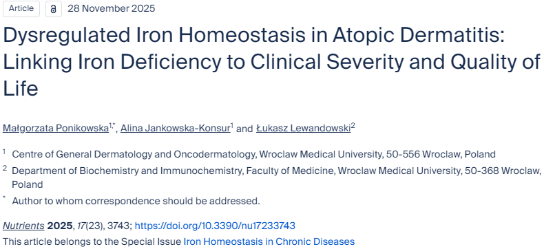 Małgorzata Ponikowska et al, Dysregulated Iron Homeostasis in Atopic Dermatitis: Linking Iron Deficiency to Clinical Severity and Quality of Life, Nutrients (2025). DOI: 10.3390/nu17233743.