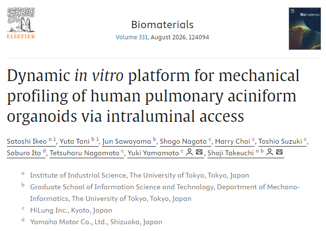 Satoshi Ikeo,Yuta Tani,Jun Sawayama, et al. Dynamic in vitro platform for mechanical profiling of human pulmonary aciniform organoids via intraluminal access, Biomaterials,Volume 331, August 2026, 124094, doi:10.1016/j.biomaterials.2026.124094