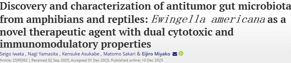 Seigo Iwata et al, Discovery and characterization of antitumor gut microbiota from amphibians and reptiles:Ewingella americana as a novel therapeutic agent with dual cytotoxic and immunomodulatory properties, Gut Microbes (2025). DOI: 10.1080/19490976.2025.2599562.