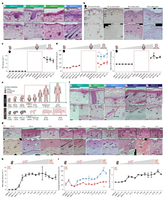 长久以来,人类进化过程中为何逐渐脱去毛发,一直是科学界和公众津津乐道的未解之谜,而伴随毛发减少出现的,是皮肤中一种名为“表皮嵴”(rete ridges)的微观结构,这些嵴状起伏如同皮肤的“生物魔术贴”,牢牢固定表皮与真皮,维持着皮肤的弹性和强韧。然而,它们的形成时机与分子机制,多年来始终笼罩在迷雾之中,过去,科学家普遍认为这些皮肤微观结构在胚胎发育早期就已定型,因此对其起源知之甚少。更棘手的是,长期以来,科研选错了“模特”。当人们观察不同动物的皮肤时,首先注意到的往往是皮毛的差异,殊不知,表皮嵴隐藏在皮肤表面之下。