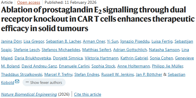 Janina Dörr et al, Ablation of prostaglandin E2 signalling through dual receptor knockout in CAR T cells enhances therapeutic efficacy in solid tumours, Nature Biomedical Engineering (2026). DOI: 10.1038/s41551-025-01610-6.