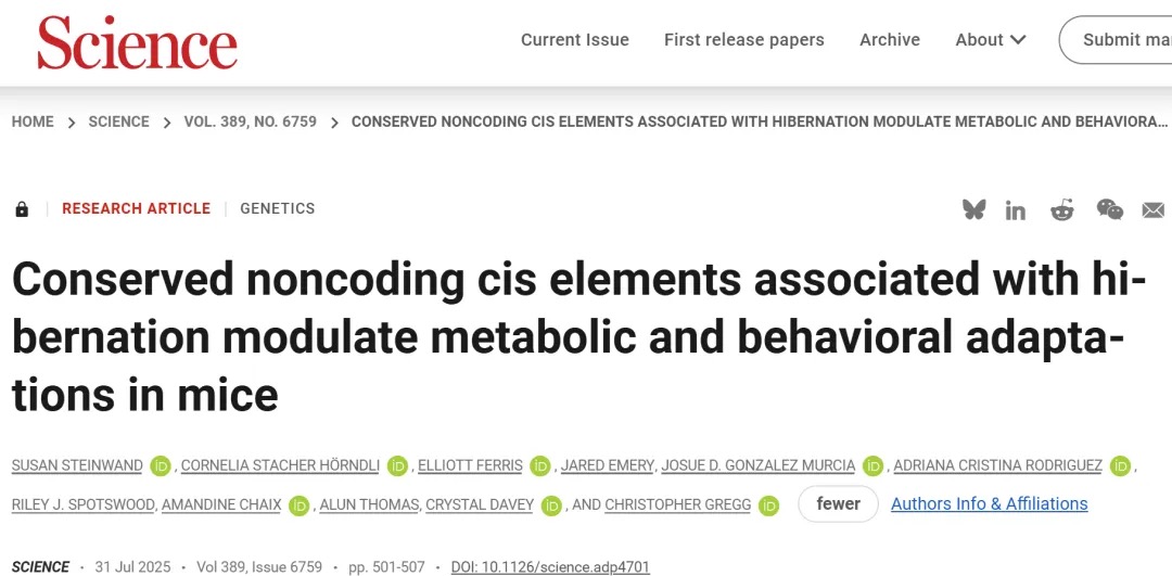 2025年7月31日,犹他大学Christopher Gregg团队在Science 在线发表题为“Genomic convergence in hibernating mammals elucidates the genetics of metabolic regulation in the hypothalamus”的研究论文,该研究使用冬眠谱系中的趋同进化变化来定义保守的顺式调控元件(CREs)和代谢程序。