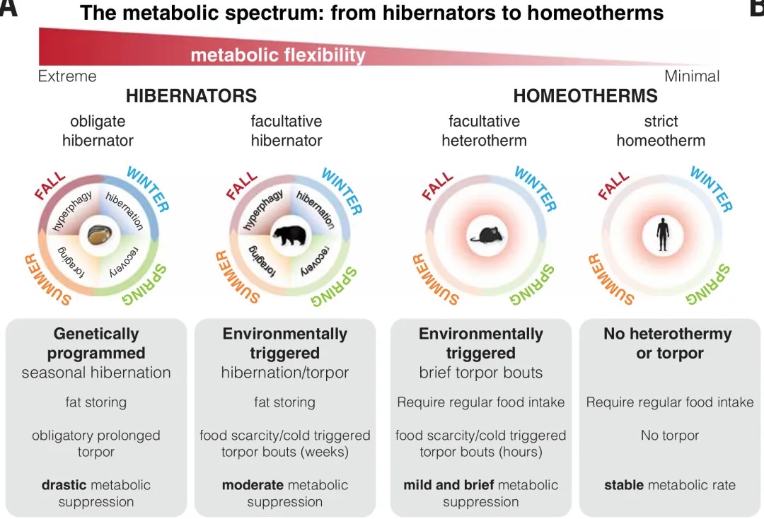 代谢特征的物种差异为新陈代谢的遗传控制提供了一个视角。冬眠是一种极端的代谢表型,在哺乳动物中反复进化。专性冬眠者会经历季节性的行为和代谢变化,增加高达50%的体重,并进入长时间的冬眠,由脂肪储备维持,而兼性冬眠者则表现出短暂的冬眠,以应对应激。相比之下,恒温动物全年保持稳定的代谢率。冬眠适应提供了对代谢控制、肥胖、神经保护、神经变性逆转、改善胰岛素敏感性、肿瘤休眠和延长寿命的见解。