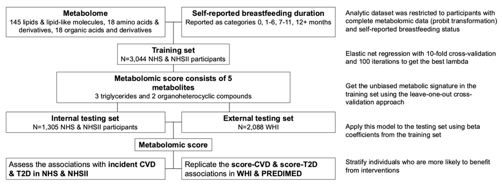 本研究在多队列中鉴定出与母乳喂养时长相关的5种血浆代谢物评分,该评分显著降低女性2型糖尿病和心血管疾病风险,揭示了代谢途径的介导作用。