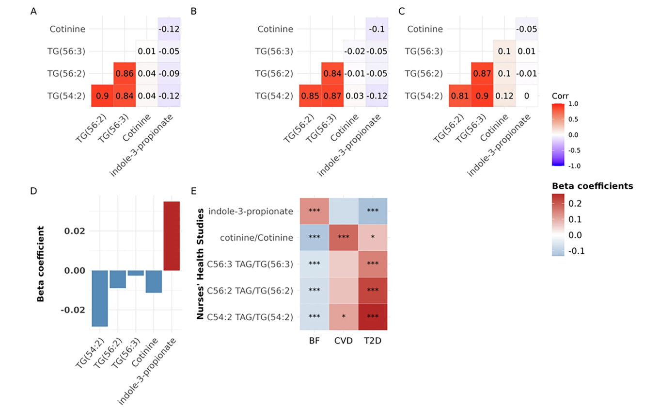 研究团队利用护士健康研究(NHS/NHSII,n=4349)的队列数据,通过弹性网络正则化回归,从181种非靶向血浆代谢物中筛选出5种与终身母乳喂养总时长相关的代谢物,构建了专属代谢组学评分。这5种代谢物包括3种高度相关的甘油三酯(C54:2甘油三酯、C56:2甘油三酯、C56:3甘油三酯)、可替宁和吲哚-3-丙酸。其中,甘油三酯和可替宁与母乳喂养时长呈负相关,吲哚-3-丙酸则呈正相关,且吲哚-3-丙酸与其他4种代谢物在各队列中均呈负相关。