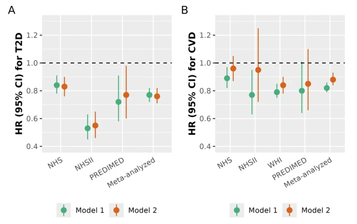 在多变量Cox回归分析中,调整年龄、种族、孕前体重指数、生活方式等混杂因素后,该代谢组学评分与2型糖尿病风险呈现显著负相关。合并分析显示,评分每增加1个标准差,2型糖尿病风险降低24%(HR=0.76,95%CI=0.71-0.82),这一结果在NHS、NHSII和PREDIMED三个队列中均得到一致验证。针对心血管疾病(包括冠心病、冠状动脉血运重建和卒中),评分每增加1个标准差,风险降低12%(HR=0.88,95%CI=0.84-0.93),且在4个队列中无显著异质性。