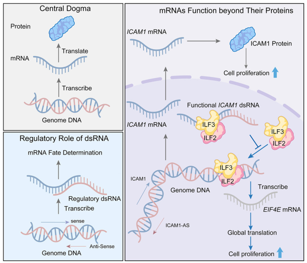 白细胞介素增强子结合因子2和ILF3被鉴定为双链RNA结合蛋白,同时也作为转录因子发挥作用。在本研究中,作者发现了ICAM1 mRNA不依赖于其编码蛋白质的功能。具体而言,作者发现ICAM1 mRNA与其反义转录本相互作用,形成长链双链RNA结构。该结构能够捕获ILF2/ILF3,从而阻止它们转录包括翻译起始因子EIF4E在内的靶基因,最终导致全局蛋白质翻译水平下降。