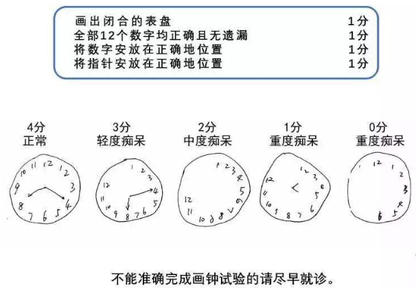 • 画钟测试:一个简单但有效的测试,要求被试者画出一个有时针、分针并指向特定时间的钟表,能初步评估其视觉空间、执行功能等能力。