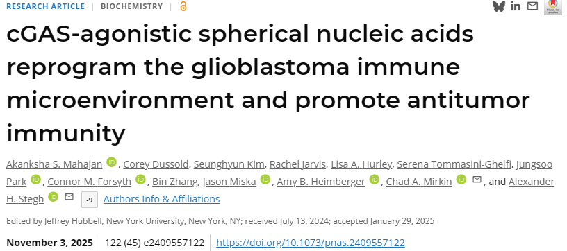 Akanksha S. Mahajan et al, cGAS-agonistic spherical nucleic acids reprogram the glioblastoma immune microenvironment and promote antitumor immunity, Proceedings of the National Academy of Sciences (2025). DOI: 10.1073/pnas.2409557122.