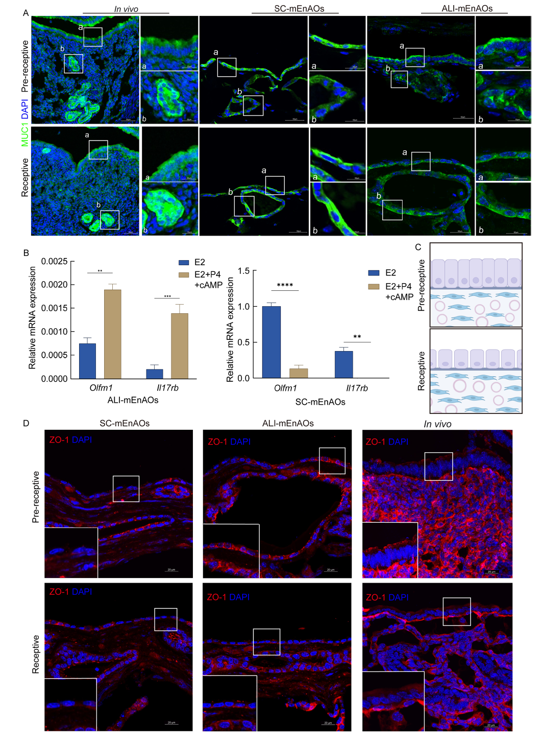 更重要的是,它还能像体内腔上皮一样“随激素变状态”:在预容受阶段,腔上皮样结构的紧密连接蛋白ZO-1呈连续分布,维持着整齐的柱状形态(为迎接胚胎做准备);进入容受阶段后,ZO-1表达减少,紧密连接变松——这正是体内子宫内膜为让胚胎“钻进来”做的关键调整。而浸没培养的组装体,不管加哪种激素,腔上皮的紧密连接都没明显变化,没法模拟这种“迎接”前的准备。