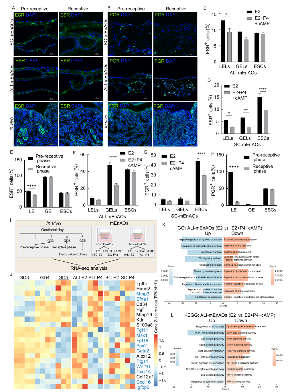 随后,团队用两种方式培养组装体:一种是气液界面培养(ALI),让组装体一面接触空气、一面接触培养基;另一种是传统的浸没培养(SC)。同时用激素模拟子宫内膜的“工作节奏”:只用雌激素(E2)模拟“预容受阶段”(准备接受胚胎前的状态),用雌激素+孕激素+cAMP模拟“容受阶段”(胚胎可成功着床的状态)。